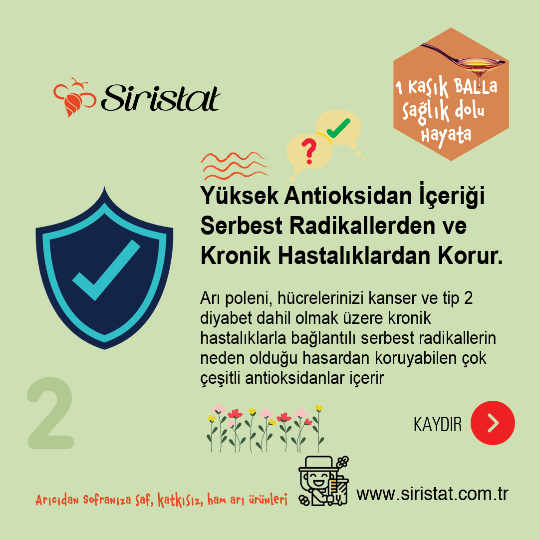 Arı poleni antioksidanlar, flavonoidler, karotenoidler, kuersetin, kaempferol ve glutatyon içerir (5).