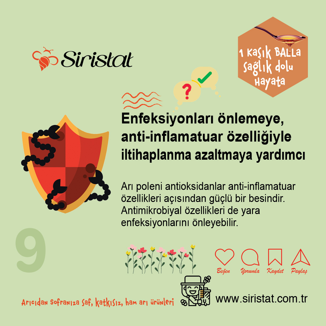 Dahası, arı polenindeki bitki bileşikleri, tümör nekroz faktörü (TNF) gibi inflamatuar hormonların üretimini uyaran biyolojik süreçleri baskılayabilir (17).
