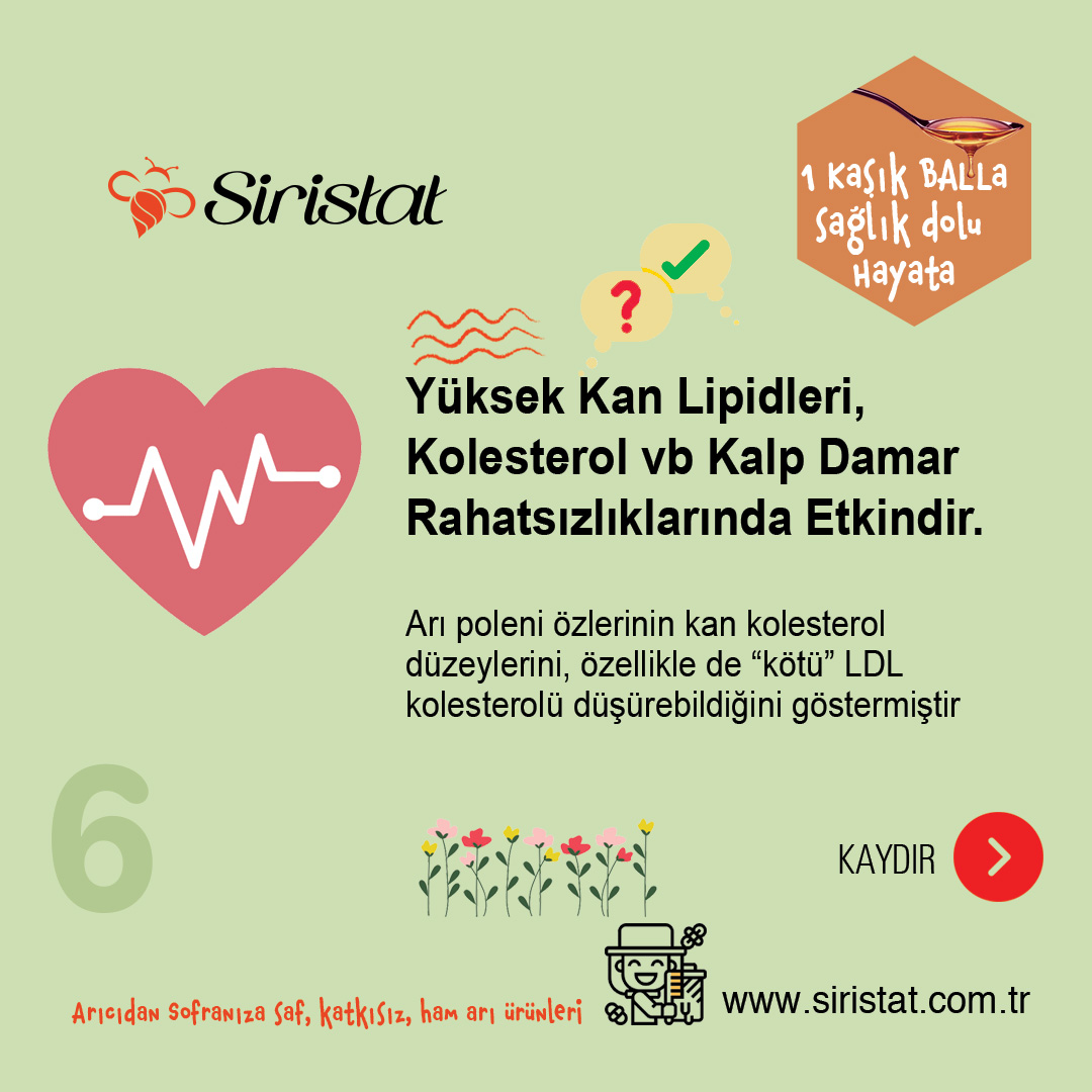 Örneğin, hayvan çalışmaları, arı poleni özlerinin kan kolesterol düzeylerini, özellikle de “kötü” LDL kolesterolü düşürebildiğini göstermiştir (10, 11).