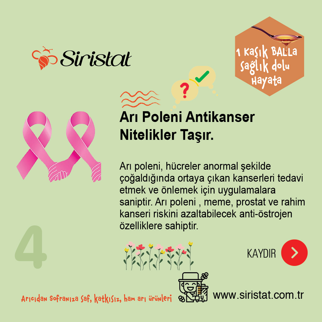 Cistus ( Cistus incanus L. ) ve ak söğüt ( Salix alba L. ) kaynaklı arı poleni, meme, prostat ve rahim kanseri riskini azaltabilecek anti-östrojen özelliklere sahip olabilir ( 25 ,26).