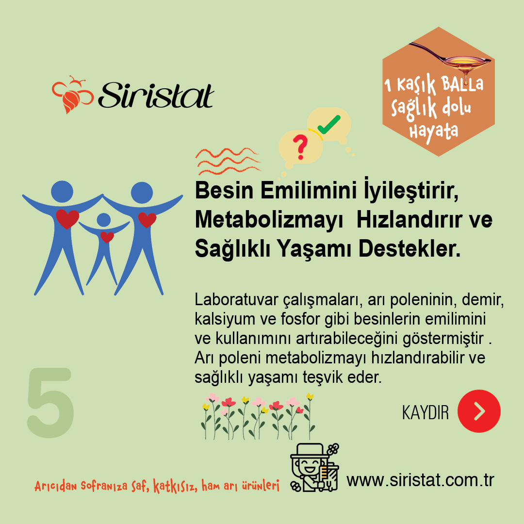Laboratuvar çalışmaları, arı poleninin, demir, kalsiyum ve fosfor gibi besinlerin emilimini ve kullanımını artırabileceğini göstermiştir. Arı poleni faydaları ile metabolizmayı hızlandırabilir ve uzun ömürlülüğü teşvik edebilir.