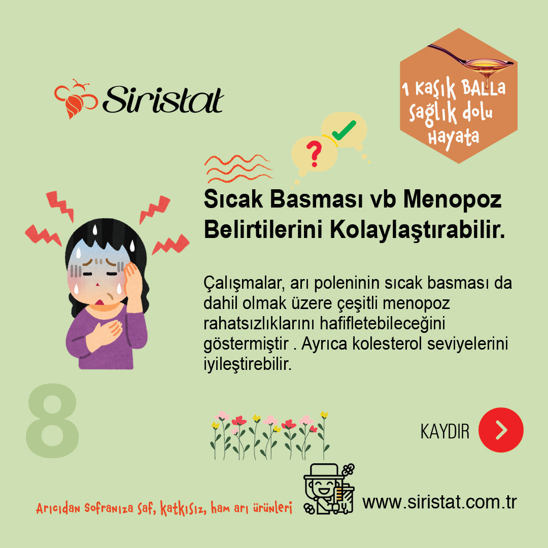 Ayrıca, üç aylık bir çalışma, arı poleni takviyesi alan kadınların önemli ölçüde daha az menopoz semptomları yaşadığını gösterdi. Ek olarak, bu takviyeler “kötü” LDL kolesterolü düşürmeye ve “iyi” HDL kolesterolü yükseltmeye yardımcı oldu (29).